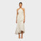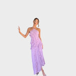 Тази ръбеста маки рокля излъчва женственост и изисканост. Асиметричният силует с елегантни волани създава прекрасен вълнообразен ефект, който подчертава фигурата и придава на роклята специален нюанс на блясък. Перфектна за тържествени поводи, сватби или вечерни събития, тази рокля носи комбинация от модерен дизайн и класическа елегантност.