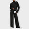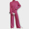 Този комплект от канелирана тъкан е идеален за тези, които търсят модерен и удобен вид. С блуза с висок яка и панталони с широки крачоли, предлага флуиден силует, термален комфорт и изискано докосване. Перфектен за стилни дни на почивка, работа от вкъщи или дори градски casual вид с маратонки или ботуши.