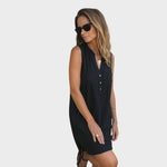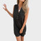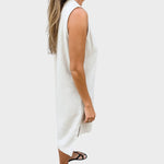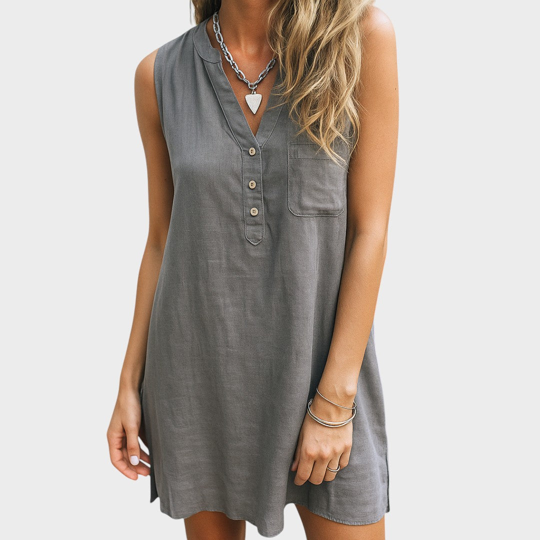Тази лека и проветрива рокля е перфектният избор за топлите дни. Без ръкави, с модерен V-образен деколте и декоративни копчета, предлага комфорт и проста елегантност. Практичен джоб отпред добавя специален детайл и я прави още по-функционална. Идеална е за разходки, почивка или неформални срещи с приятели.