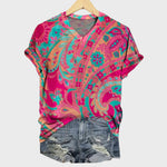 Изпъкнете с тази ярка тениска в интензивни нюанси на фуксия и тюркоаз, с впечатляващи цветни мотиви. Нейният небрежен дизайн с къси ръкави и удобен крой прави тениската идеална за летни излети, ежедневни разходки и небрежни комбинации, изпълнени с енергия и стил.