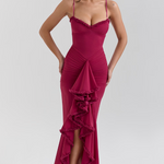 Впечатляваща и женствена рокля с прилягащ силует, която оформя тялото и подчертава силуета. Детайлите с волани на деколтето и полата внасят дъх на романтика и елегантност. Идеална за вечерни излизания и специални поводи, когато искате да бъдете в центъра на вниманието.