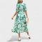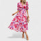 Тази дълга рокля с V-образно деколте и ръкави тип фенер е ода на съвременната женственост. С ярък цветен принт и флуиден силует, тя предлага изискан вид без компромиси в удобството. Идеална за слънчеви дни, специални събития или вечери на открито.