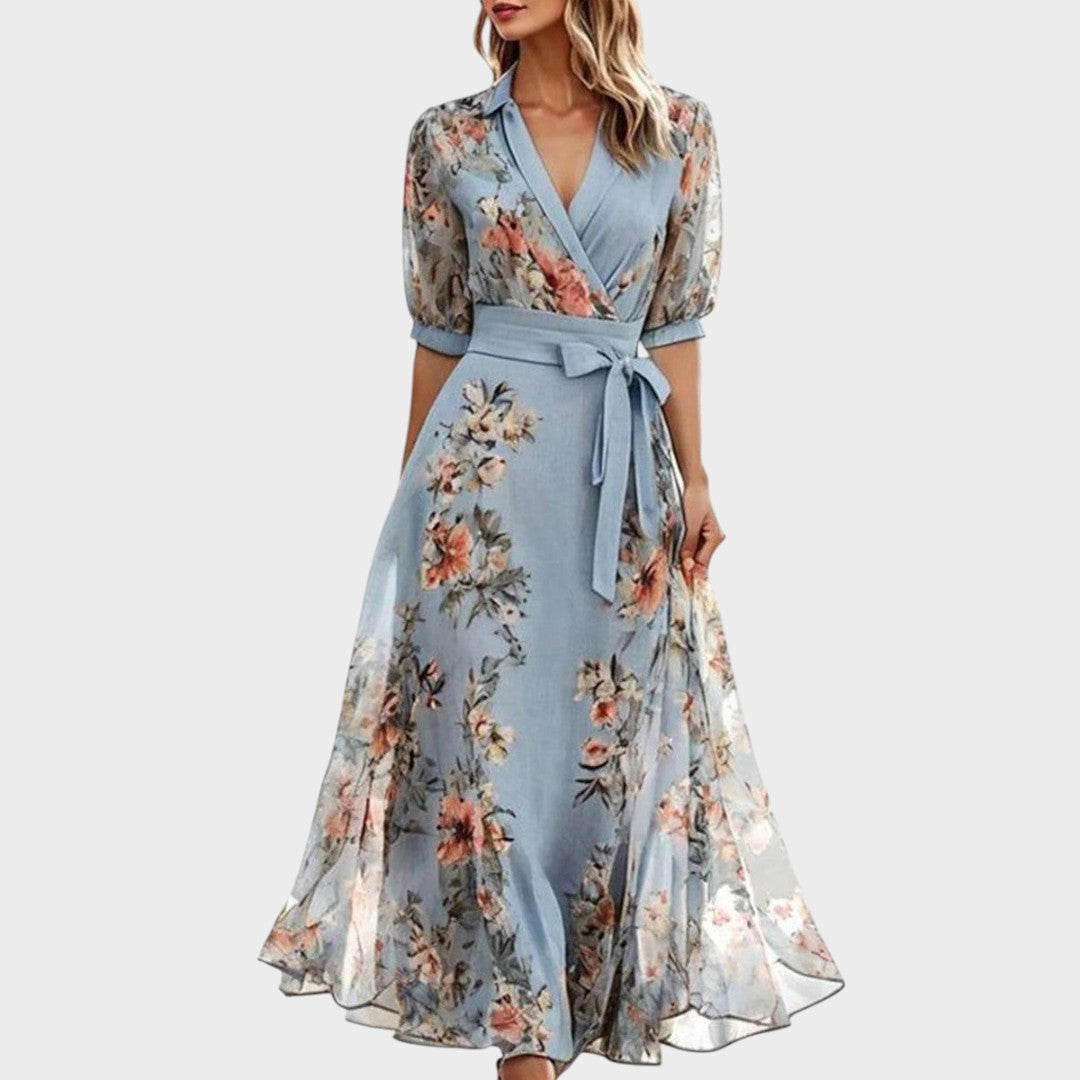 Тази миди рокля излъчва грация и романтика благодарение на изисканото си кроене и лек материал, който осигурява комфорт през целия ден. Цветният десен внася свежест и специален нюанс на женственост, докато практичните джобове я правят перфектна комбинация от елегантност и функционалност. Идеална е за разходки, срещи или специални поводи, когато искате да блеснете с лекота.