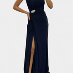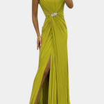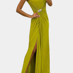 Безупречна фузия на флуидност, елегантност и сценично присъствие. Емилия се отличава с изработката си от лека тъкан, внимателно изработени плисирни детайли и страничен изрез, който следва всяко движение с грация. Изрязаното деколте нежно оформя линията на врата, докато флуидната силуета деликатно и изискано удължава фигурата.