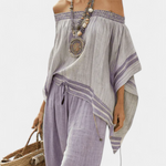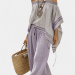 Бамбукова блузка с райета, с открити рамене и широки панталони за елегантен и свеж стил