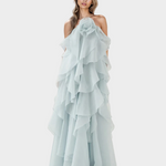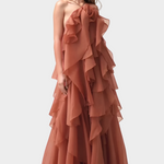 Тази прекрасна дълга рокля в топъл кафяв нюанс излъчва лукс и романтика. Дизайнирана с многостепенни волани от лека и прозрачна тъкан, създава впечатляващо движение при всяка ваша крачка.