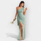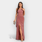 Елегантна и модерна, тази рокля комбинира асиметричен крой с флуиден материал за изискан и женствен вид. Идеална за специални поводи и блестящи вечери.