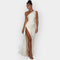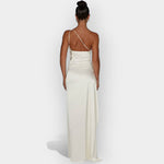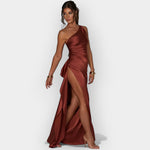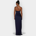 Тази рокля излъчва фина луксозност с гладък сатен и елегантна линия. Идеална за вечерни излизания и специални поводи, които изискват изтънченост и стил.