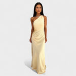 Роклята Аурелия е истински лукс в движение. С асиметрично деколте, сатенен материал и обвити набрани детайли, тя е перфектният избор за блясък на специални поводи без компромис в удобството.