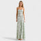 Тази дълга рокля комбинира етеричната магия на цветните бродерии с естествено стесняваща се силуета. Структурното деколте и тънките презрамки я правят изискан избор за специални поводи, сватби или незабравими вечери.