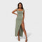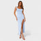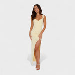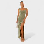 Роклята Констанца прекроява сложността със своя драпирано деколте и открит гръб с панделка. С тясна силуета, която удължава фигурата и страничен разрез за свобода на движение, тя е идеална за специални събития, на които искате да блеснете.