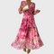 Тази елегантна макси рокля носи дъх на романтика и женственост. С дълги ръкави, V-образно деколте и колан, който подчертава талията, перфектно акцентира на фигурата, докато летящите слоеве създават леко и грациозно движение. Цветният принт ѝ придава свежест и изтънченост, правейки я идеален избор за тържествени поводи, вечерни излизания или летни романтични моменти.